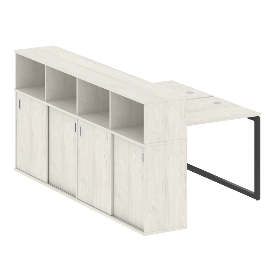 Столешницы имеют отверстия с пластиковыми заглушками кабель-канала серого цвета.