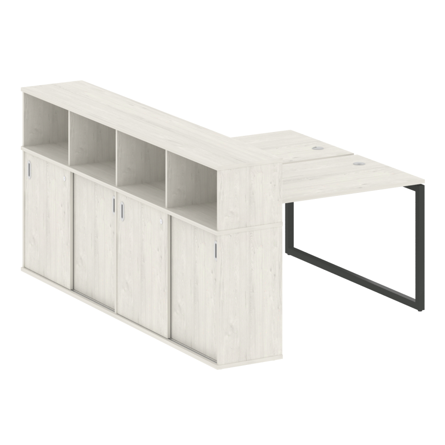 Столешницы имеют отверстия с пластиковыми заглушками кабель-канала серого цвета.