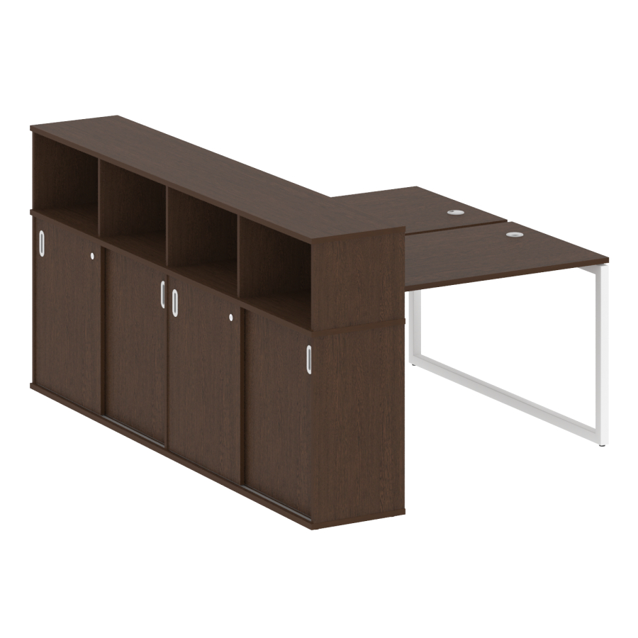 Столешницы имеют отверстия с пластиковыми заглушками кабель-канала серого цвета.