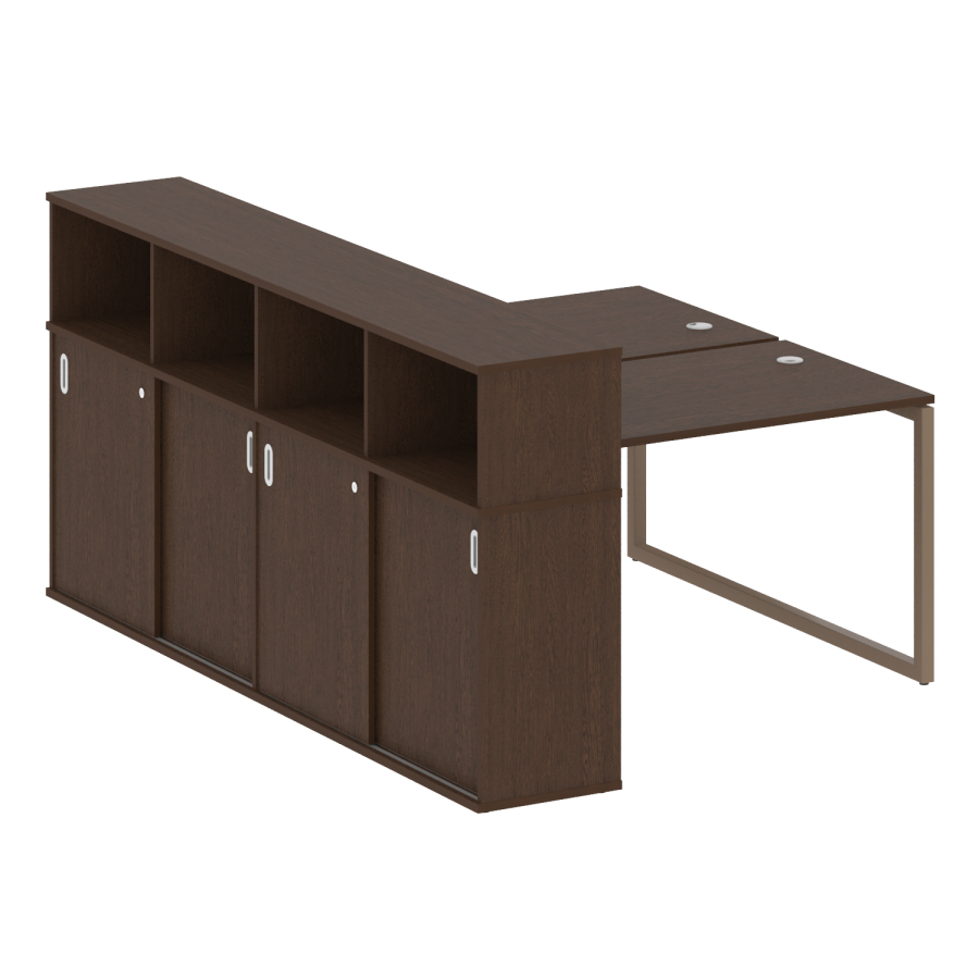 Столешницы имеют отверстия с пластиковыми заглушками кабель-канала серого цвета.