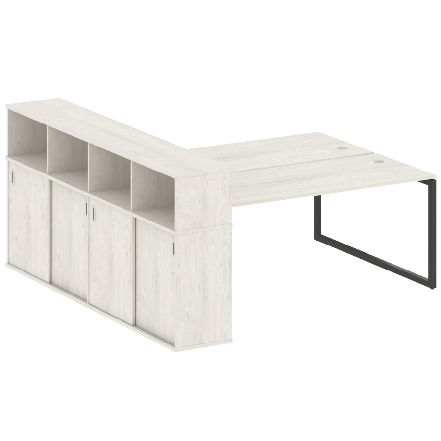 Столешницы имеют отверстия с пластиковыми заглушками кабель-канала серого цвета.