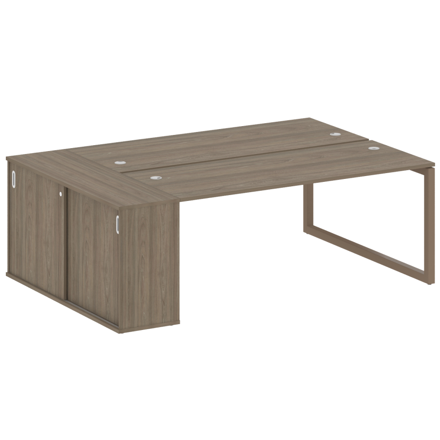 Столешницы имеют отверстия с пластиковыми заглушками кабель-канала серого цвета.