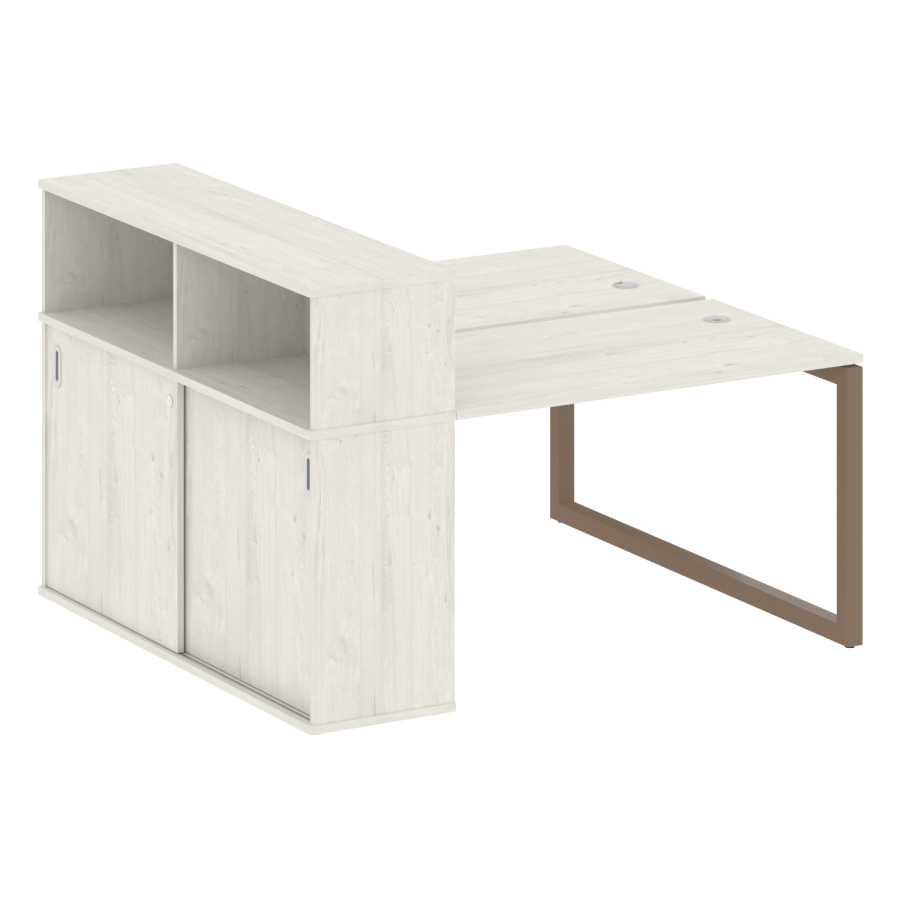 Столешницы имеют отверстия с пластиковыми заглушками кабель-канала серого цвета.