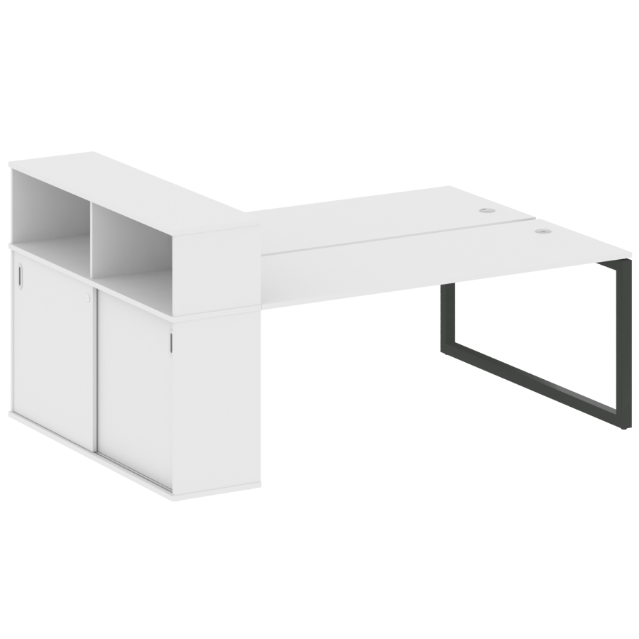 Столешницы имеют отверстия с пластиковыми заглушками кабель-канала серого цвета.