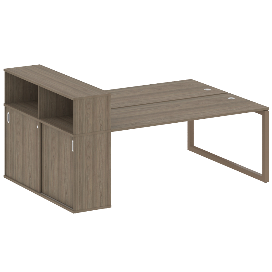 Столешницы имеют отверстия с пластиковыми заглушками кабель-канала серого цвета.