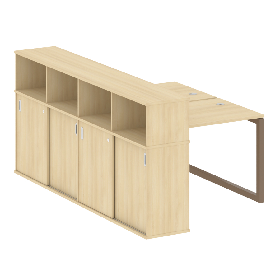 Столешницы имеют отверстия с пластиковыми заглушками кабель-канала серого цвета.