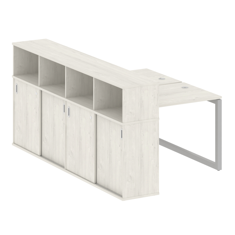Столешницы имеют отверстия с пластиковыми заглушками кабель-канала серого цвета.