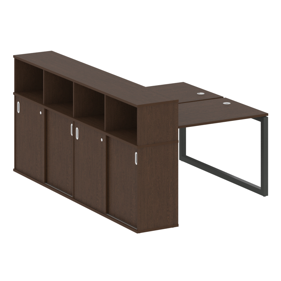 Столешницы имеют отверстия с пластиковыми заглушками кабель-канала серого цвета.