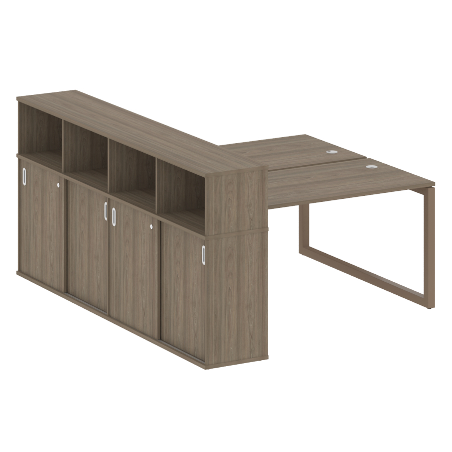Столешницы имеют отверстия с пластиковыми заглушками кабель-канала серого цвета.