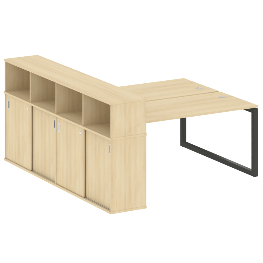 Столешницы имеют отверстия с пластиковыми заглушками кабель-канала серого цвета.