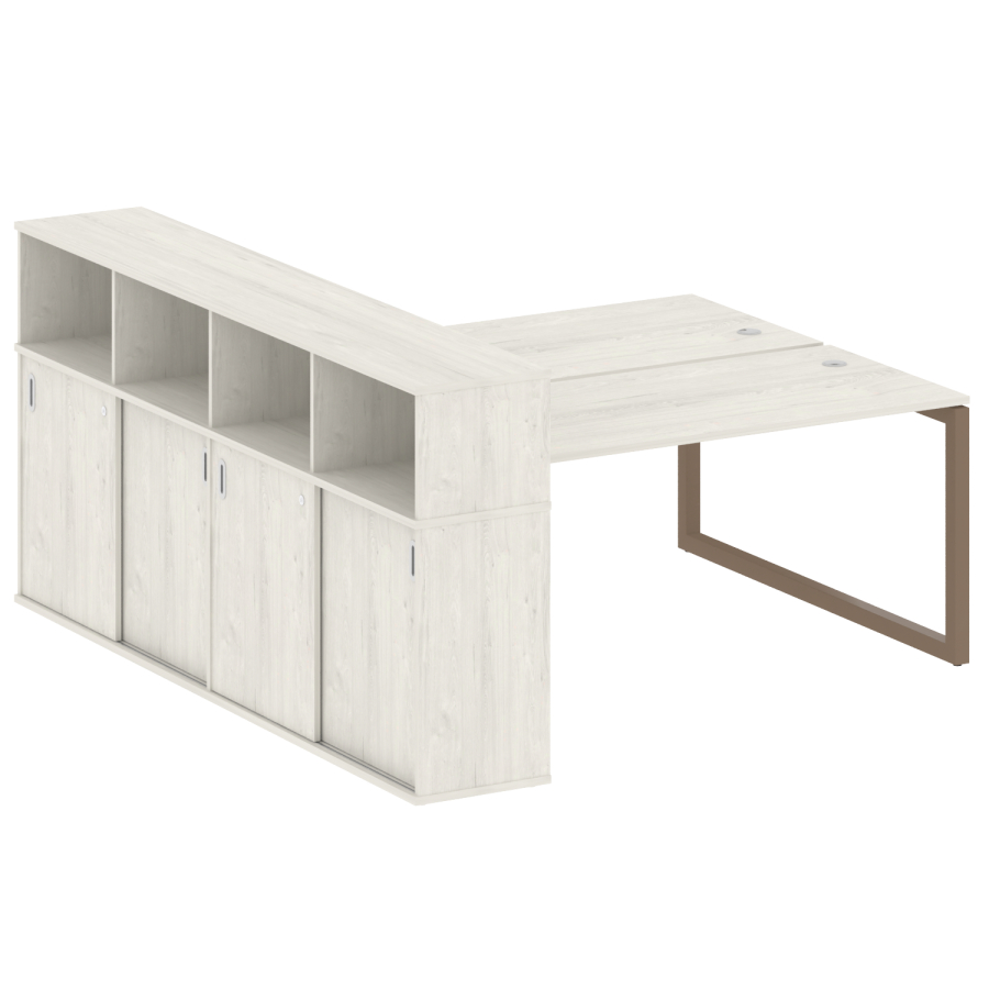 Столешницы имеют отверстия с пластиковыми заглушками кабель-канала серого цвета.