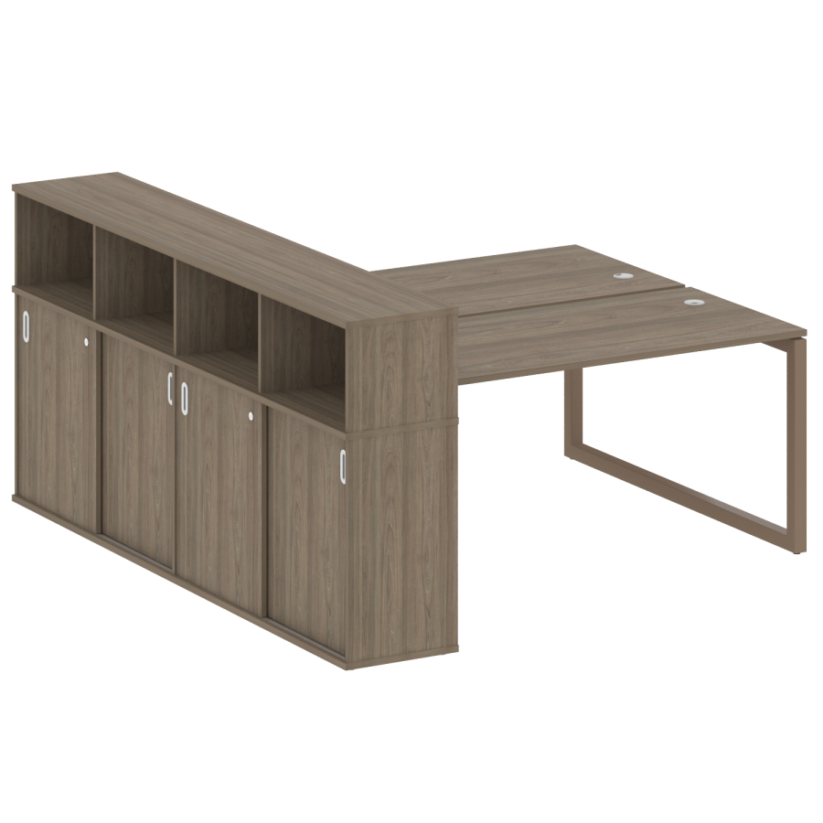 Столешницы имеют отверстия с пластиковыми заглушками кабель-канала серого цвета.