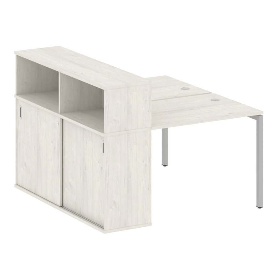 Столешницы имеют отверстия с пластиковыми заглушками кабель-канала серого цвета.