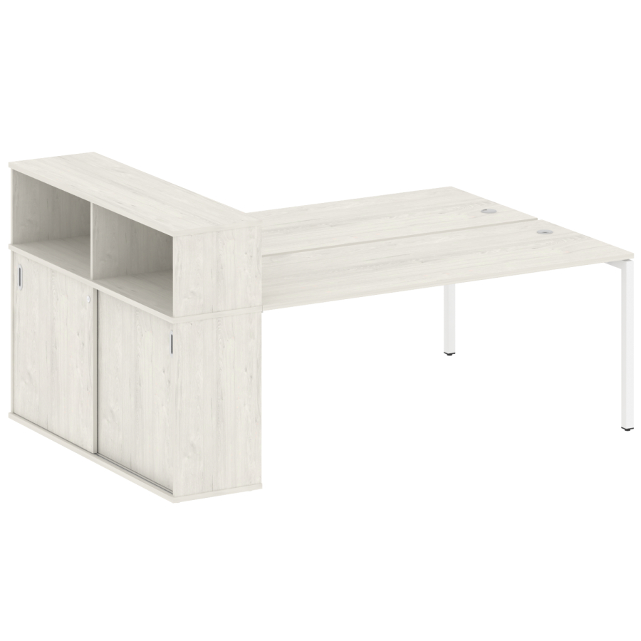 Столешницы имеют отверстия с пластиковыми заглушками кабель-канала серого цвета.