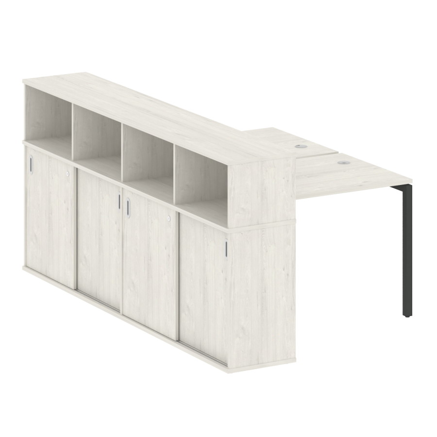 Столешницы имеют отверстия с пластиковыми заглушками кабель-канала серого цвета.