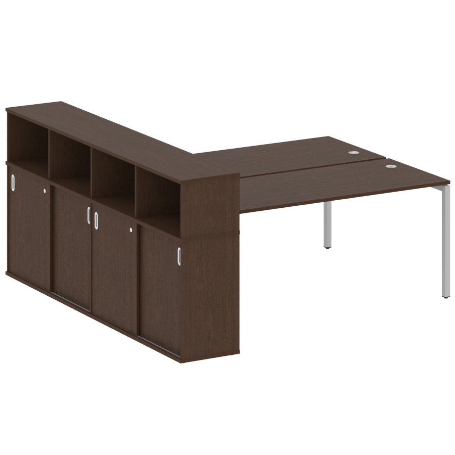 Столешницы имеют отверстия с пластиковыми заглушками кабель-канала серого цвета.