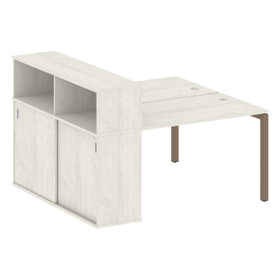 Столешницы имеют отверстия с пластиковыми заглушками кабель-канала серого цвета.