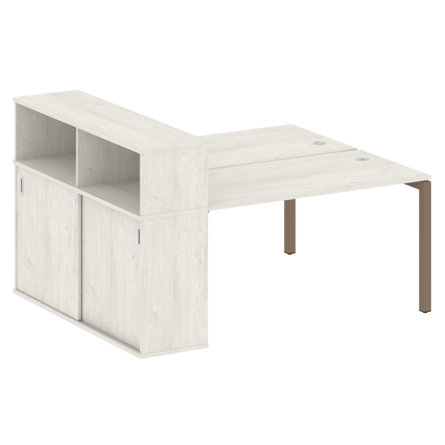 Столешницы имеют отверстия с пластиковыми заглушками кабель-канала серого цвета.