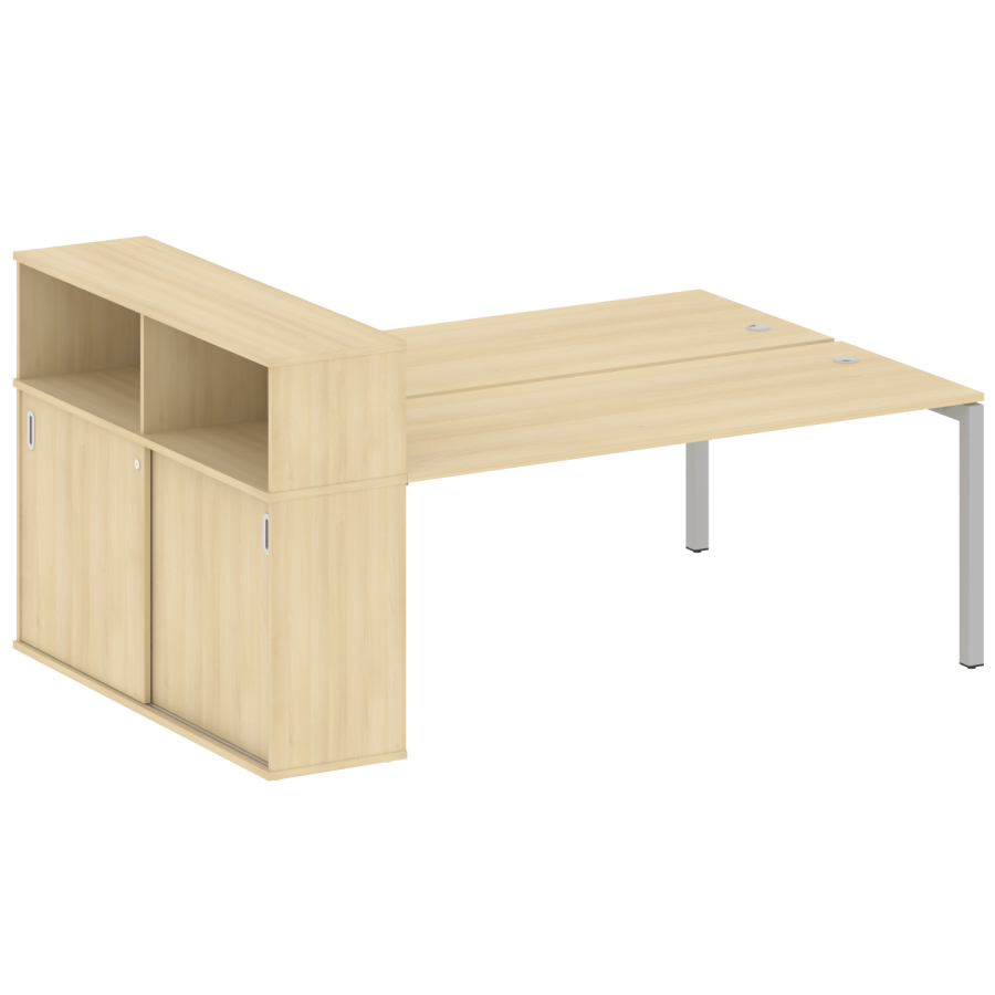 Столешницы имеют отверстия с пластиковыми заглушками кабель-канала серого цвета.
