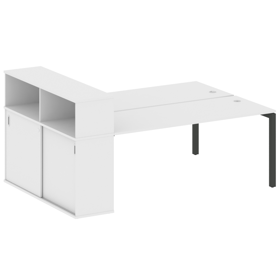 Столешницы имеют отверстия с пластиковыми заглушками кабель-канала серого цвета.