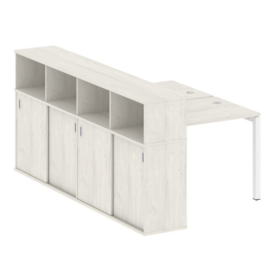Столешницы имеют отверстия с пластиковыми заглушками кабель-канала серого цвета.