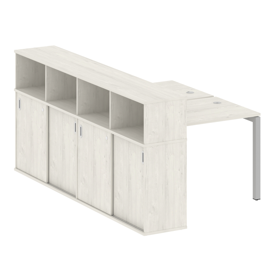 Столешницы имеют отверстия с пластиковыми заглушками кабель-канала серого цвета.