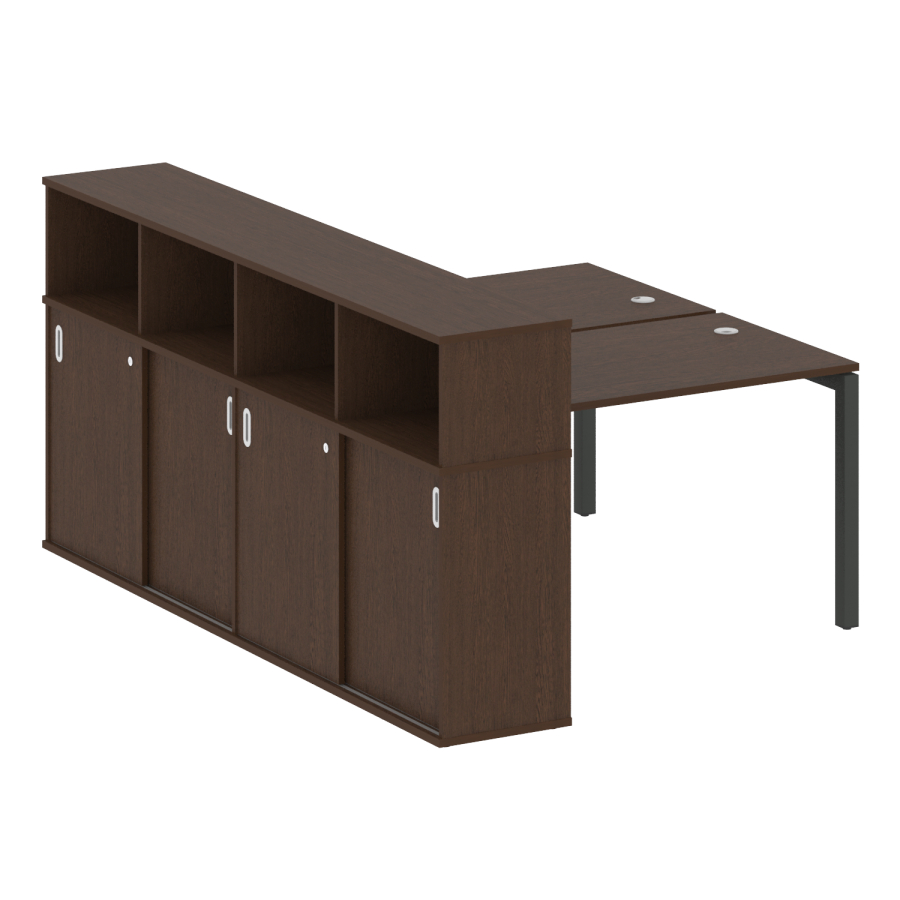 Столешницы имеют отверстия с пластиковыми заглушками кабель-канала серого цвета.