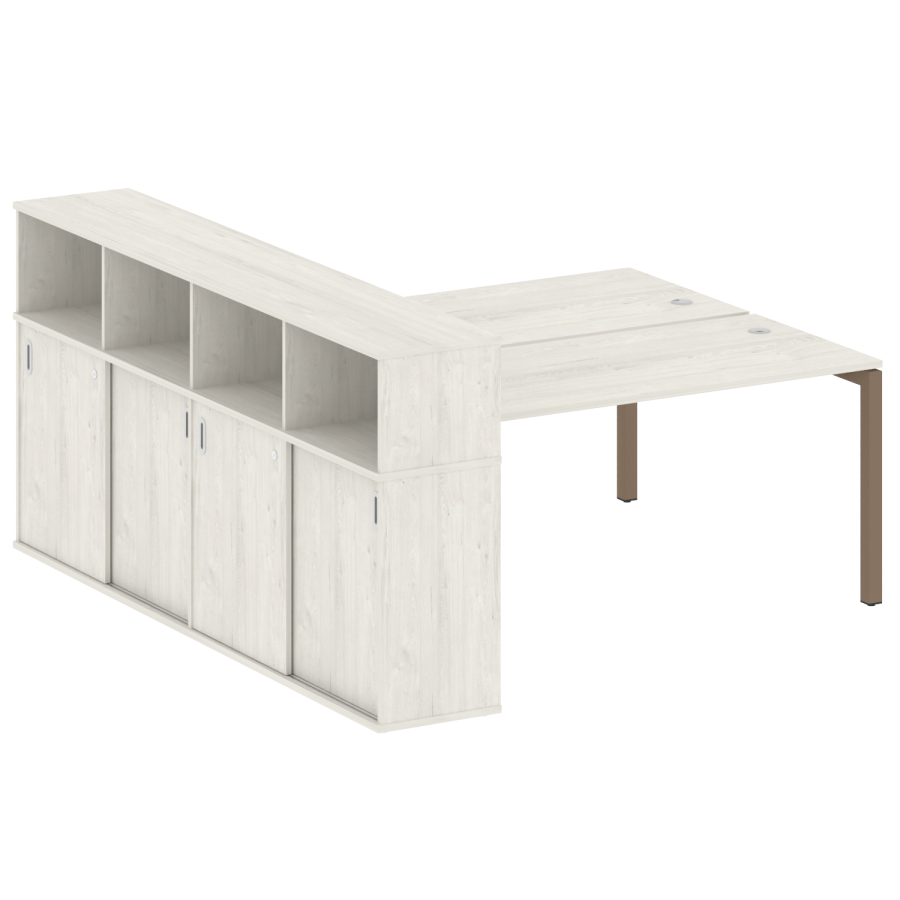 Столешницы имеют отверстия с пластиковыми заглушками кабель-канала серого цвета.