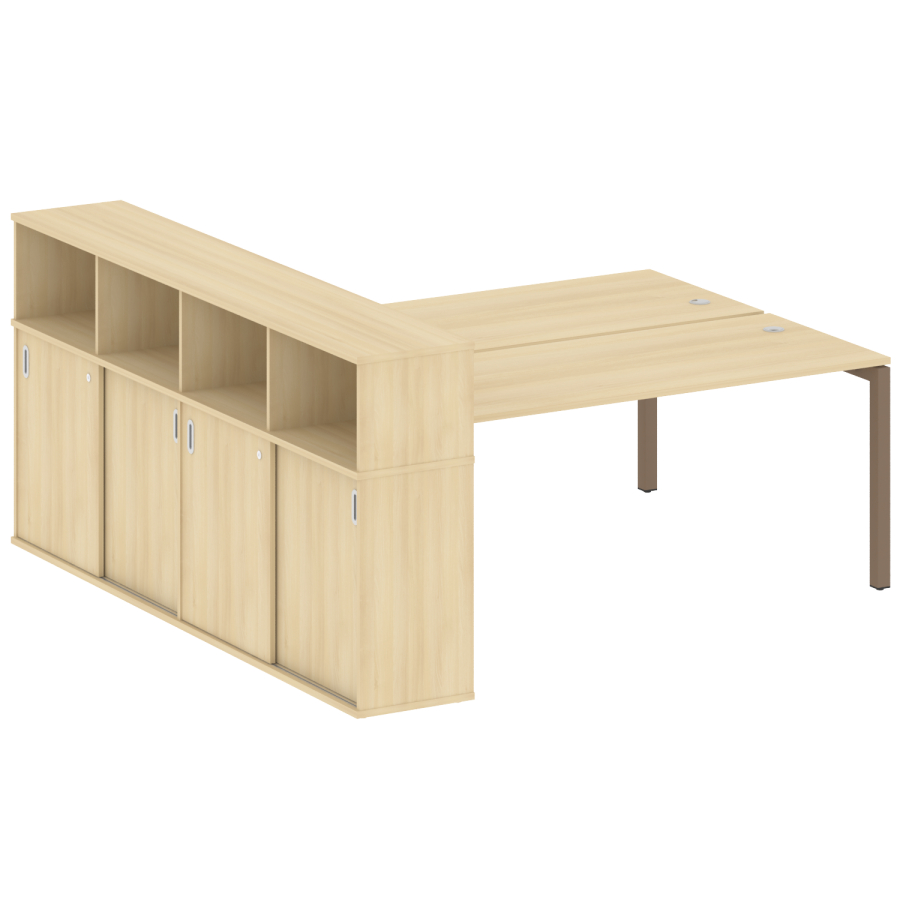 Столешницы имеют отверстия с пластиковыми заглушками кабель-канала серого цвета.