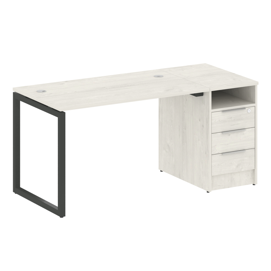 Столешницы имеют отверстия с пластиковыми заглушками кабель-канала серого цвета.
