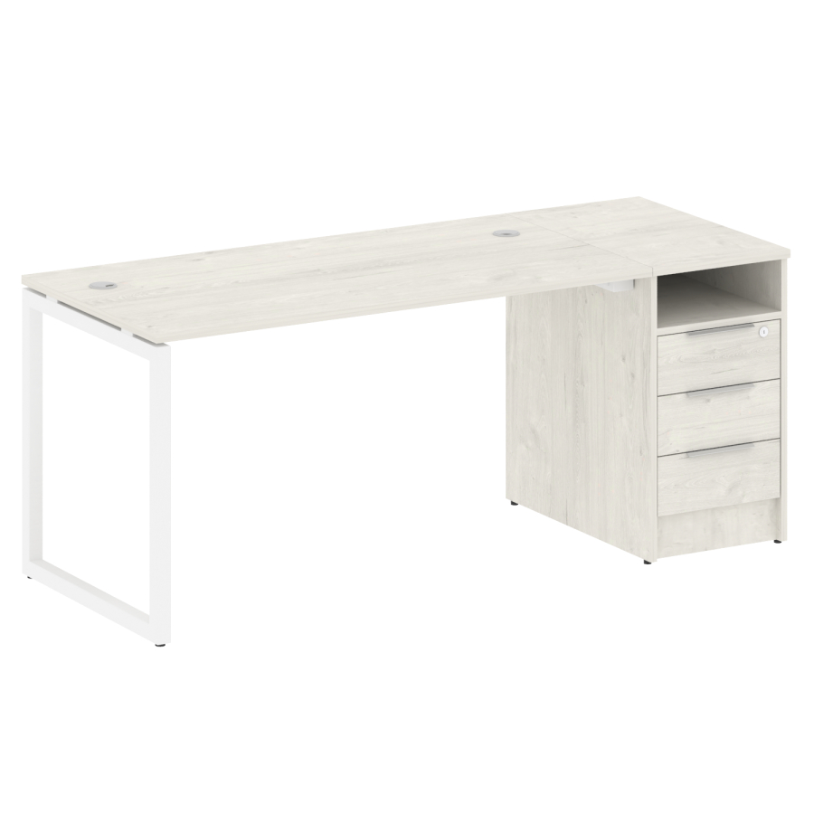 Столешницы имеют отверстия с пластиковыми заглушками кабель-канала серого цвета.