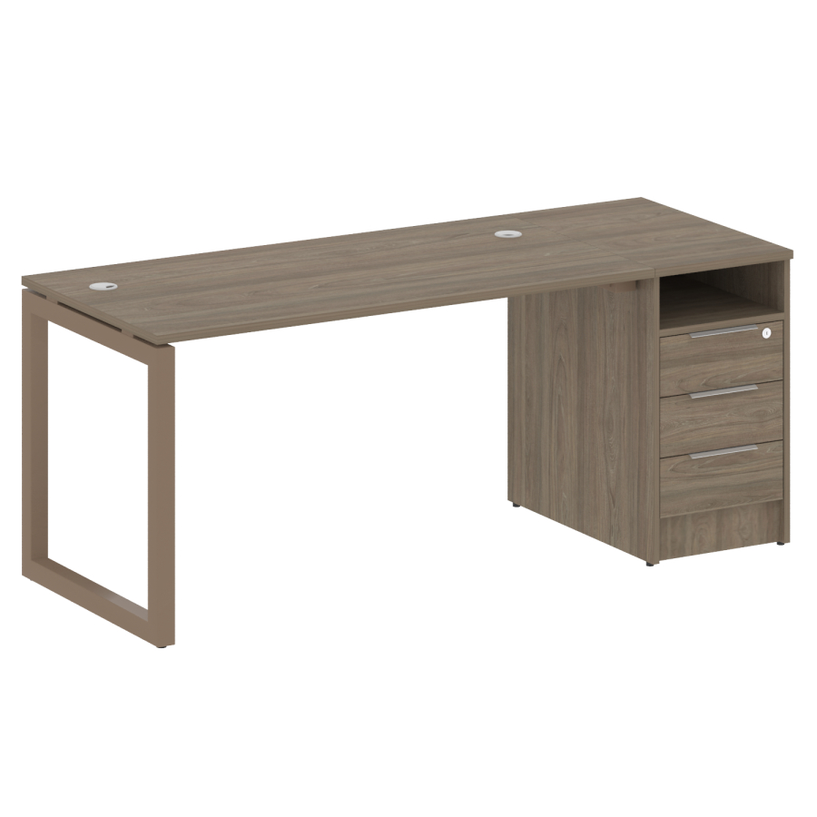 Столешницы имеют отверстия с пластиковыми заглушками кабель-канала серого цвета.