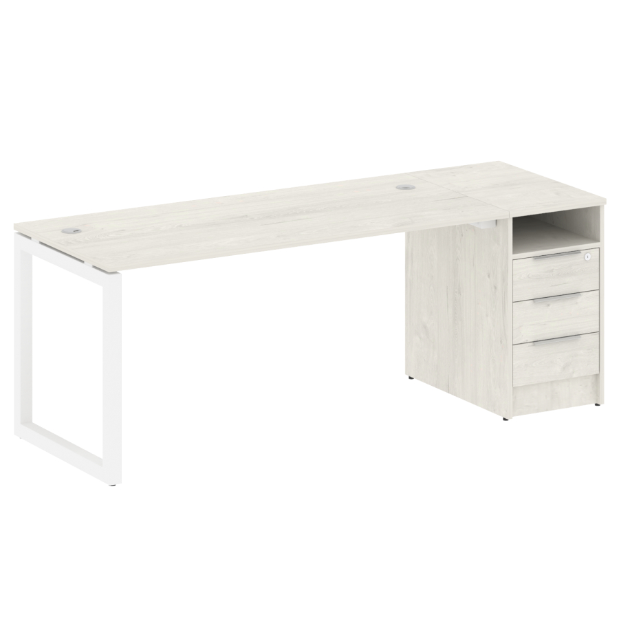 Столешницы имеют отверстия с пластиковыми заглушками кабель-канала серого цвета.