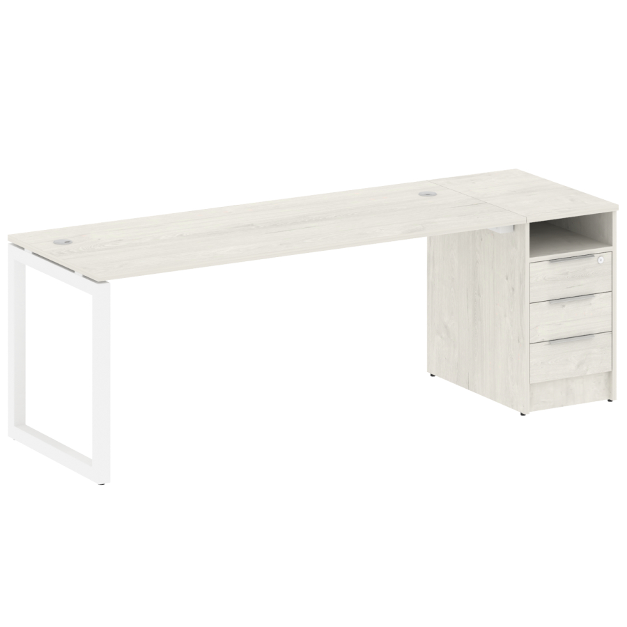 Столешницы имеют отверстия с пластиковыми заглушками кабель-канала серого цвета.