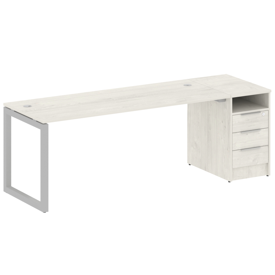 Столешницы имеют отверстия с пластиковыми заглушками кабель-канала серого цвета.