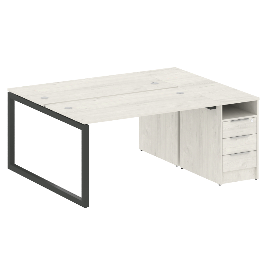 Столешницы имеют отверстия с пластиковыми заглушками кабель-канала серого цвета.