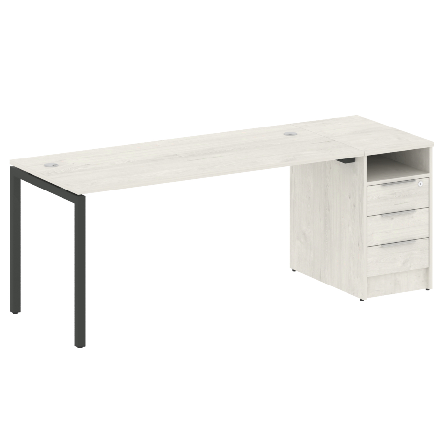 Столешницы имеют отверстия с пластиковыми заглушками кабель-канала серого цвета.