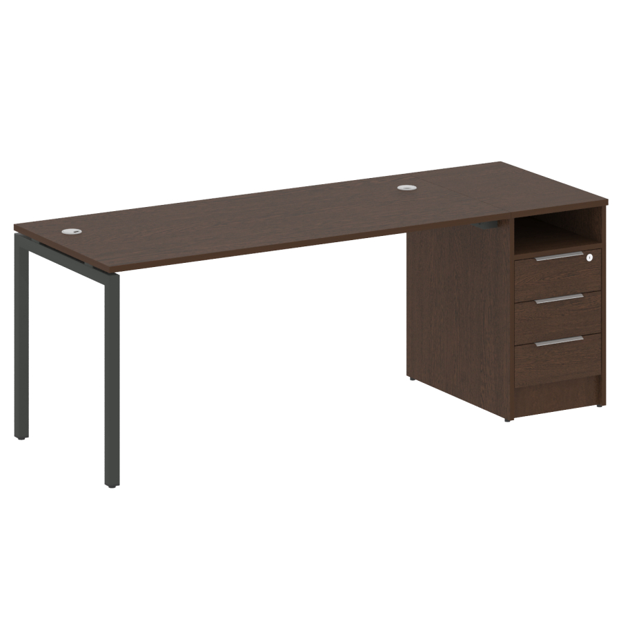 Столешницы имеют отверстия с пластиковыми заглушками кабель-канала серого цвета.
