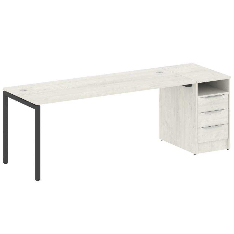 Столешницы имеют отверстия с пластиковыми заглушками кабель-канала серого цвета.