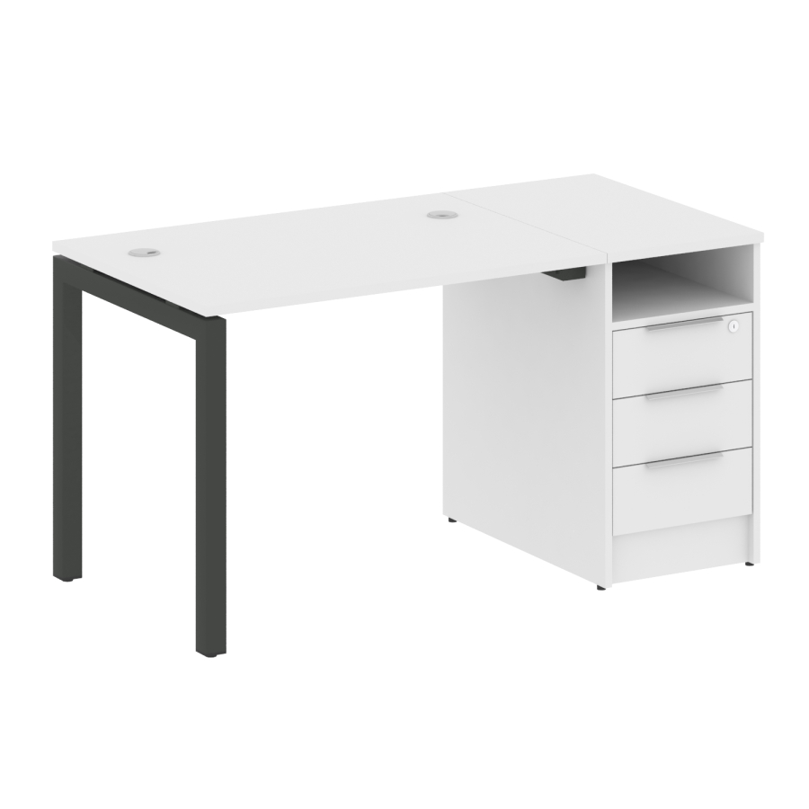 Столешницы имеют отверстия с пластиковыми заглушками кабель-канала серого цвета.