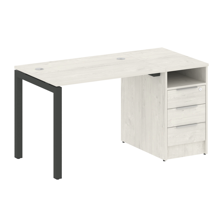 Столешницы имеют отверстия с пластиковыми заглушками кабель-канала серого цвета.