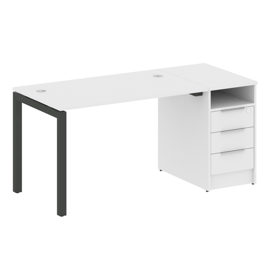 Столешницы имеют отверстия с пластиковыми заглушками кабель-канала серого цвета.