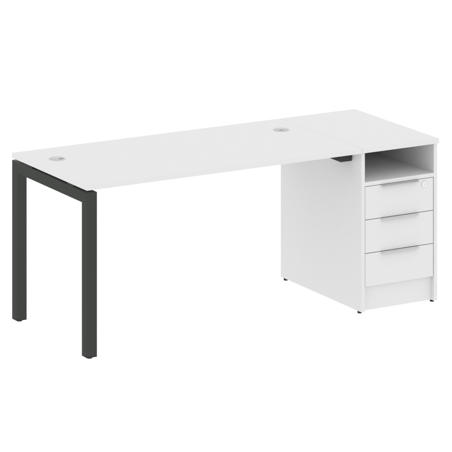 Столешницы имеют отверстия с пластиковыми заглушками кабель-канала серого цвета.