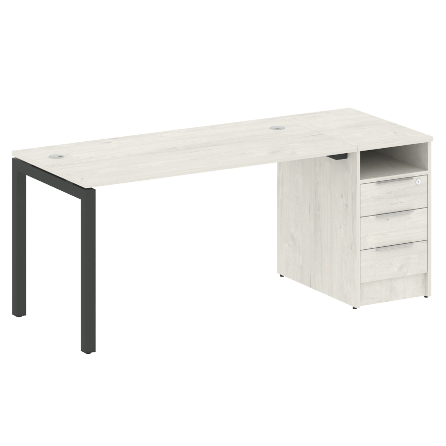Столешницы имеют отверстия с пластиковыми заглушками кабель-канала серого цвета.