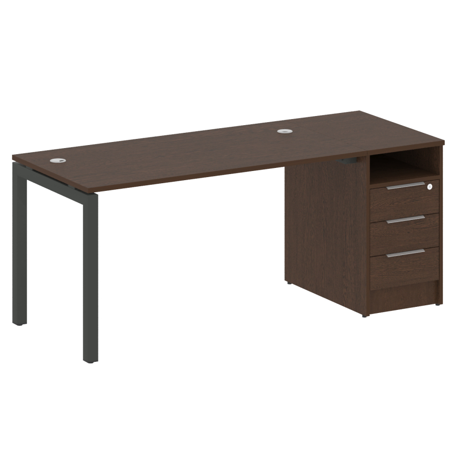 Столешницы имеют отверстия с пластиковыми заглушками кабель-канала серого цвета.