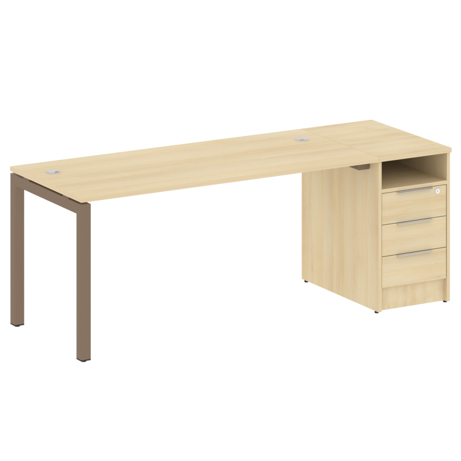 Столешницы имеют отверстия с пластиковыми заглушками кабель-канала серого цвета.