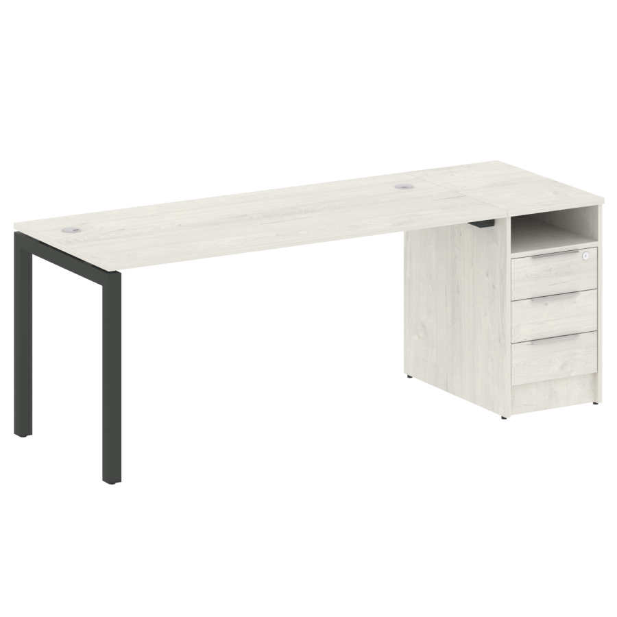 Столешницы имеют отверстия с пластиковыми заглушками кабель-канала серого цвета.