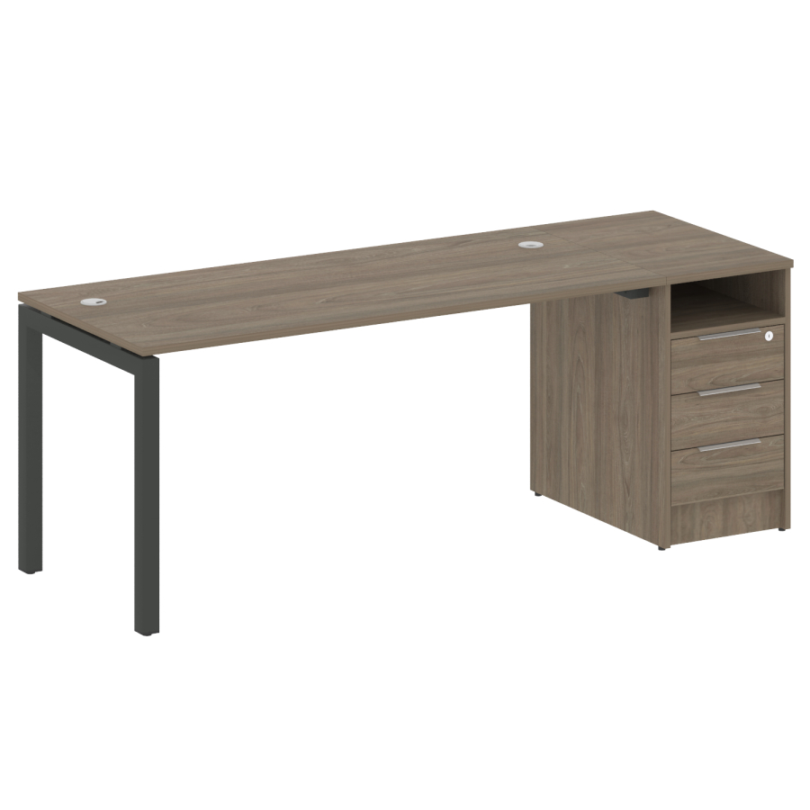 Столешницы имеют отверстия с пластиковыми заглушками кабель-канала серого цвета.