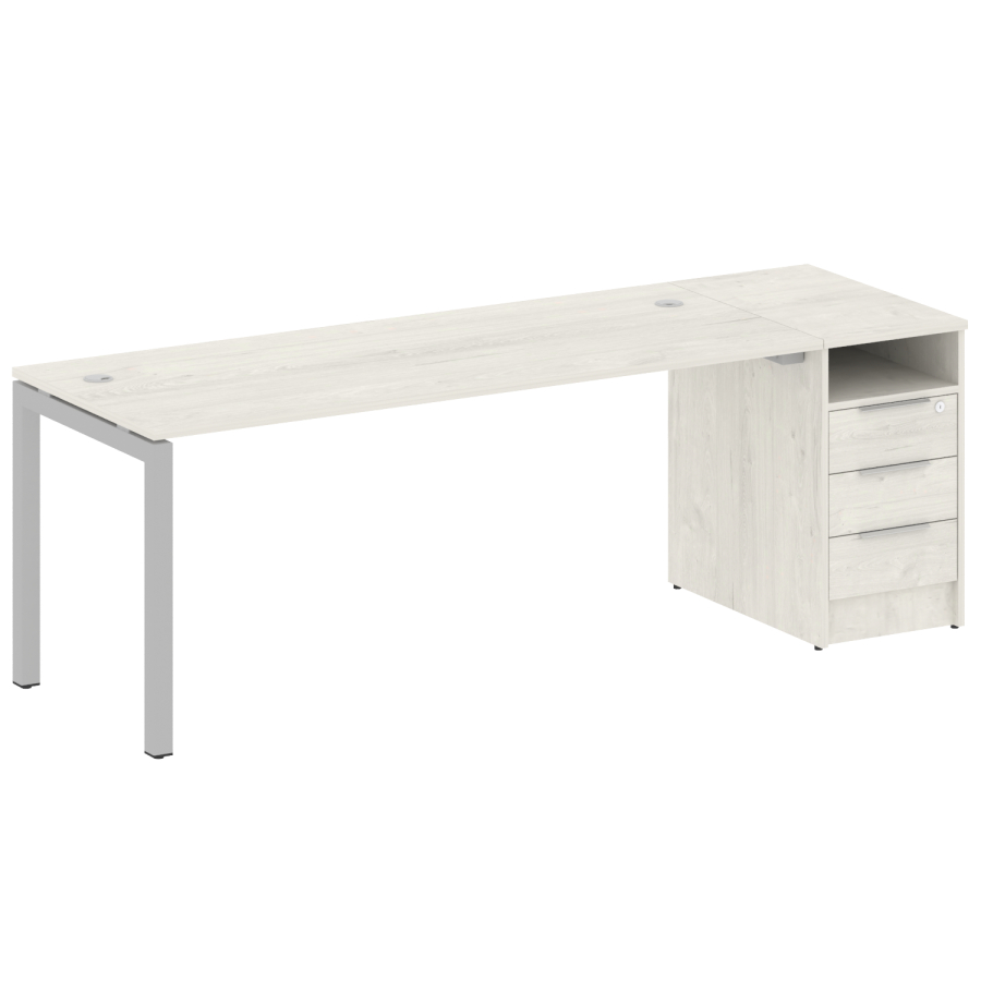 Столешницы имеют отверстия с пластиковыми заглушками кабель-канала серого цвета.
