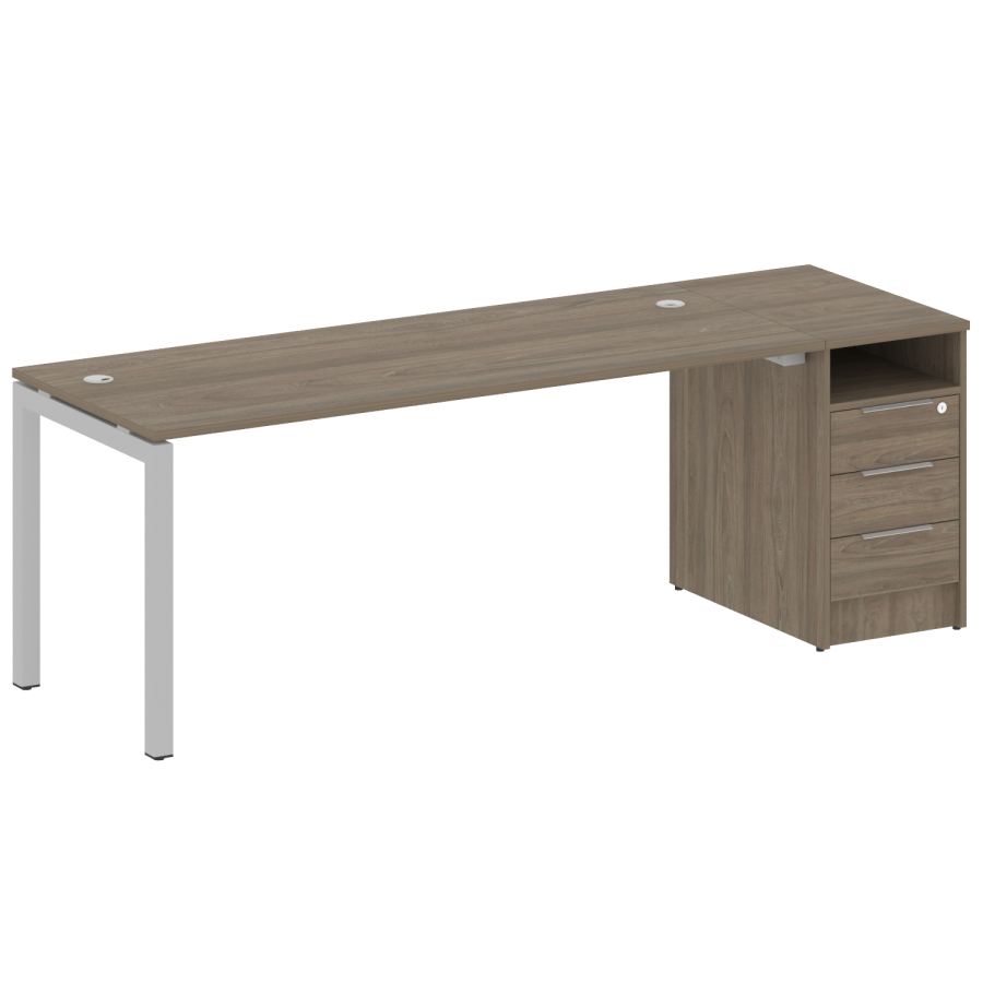 Столешницы имеют отверстия с пластиковыми заглушками кабель-канала серого цвета.